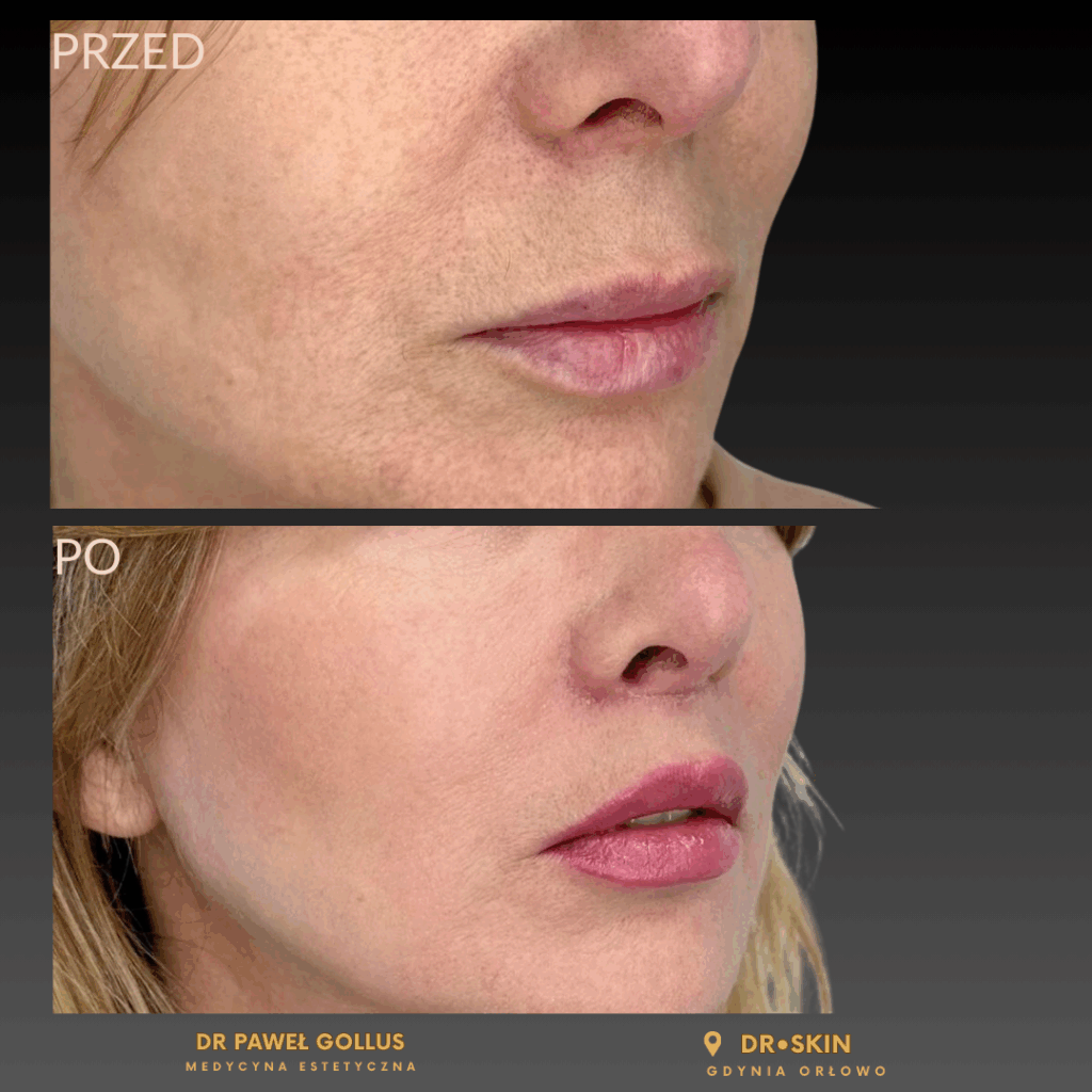 Górna warga staje się lepiej zarysowana, usta wyglądają młodziej, a twarz zyskuje świeżość.