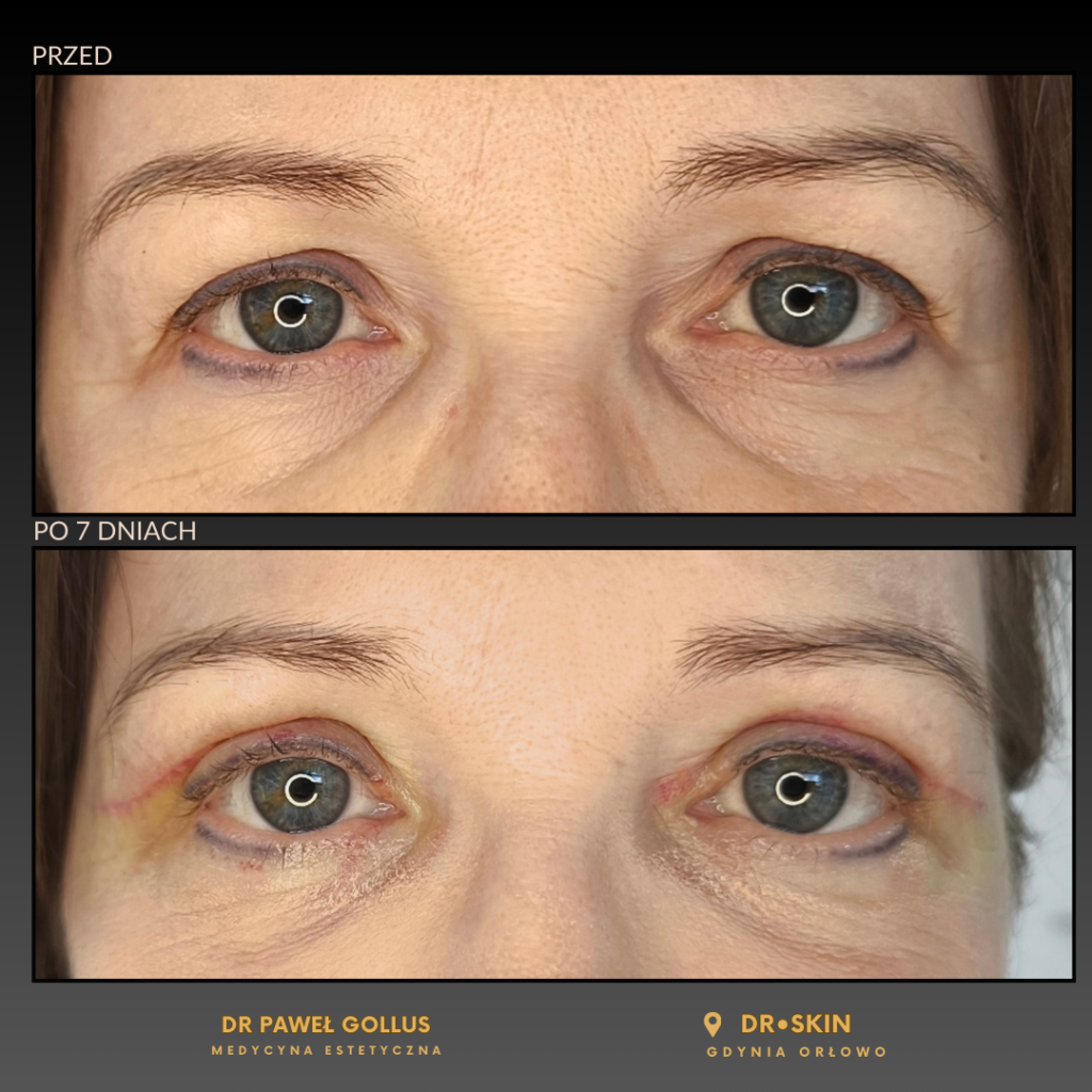 - Narysowanie oka, czyli zaplanowanie zakresu resekcji skóry – najważniejszy etap, podczas którego zabieg jest szczegółowo planowany.