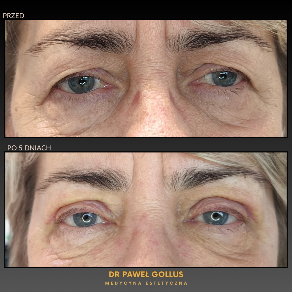 Bezpośrednio po zabiegu możesz odczuwać dyskomfort i nadmierne napięcie w okolicy zabiegowej. Możesz mieć przejściową niedomykalność oczu z powodu obrzęku. Niedomykalność może utrzymywać się 2-4 dni w zależności od stopnia nasilenia obrzęku. Aby złagodzić obrzęk stosuj zimne okłady i przestrzegaj pozostałych zaleceń.